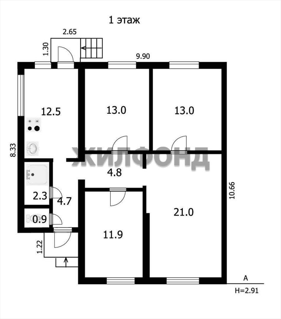 1 й этаж - прихожая, кухня 12,5 кв.м. , гостиная 21кв.м. , раздельный санузел с душевой кабиной, три спальни (по 13 и 11,9) кв.м.