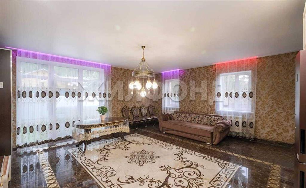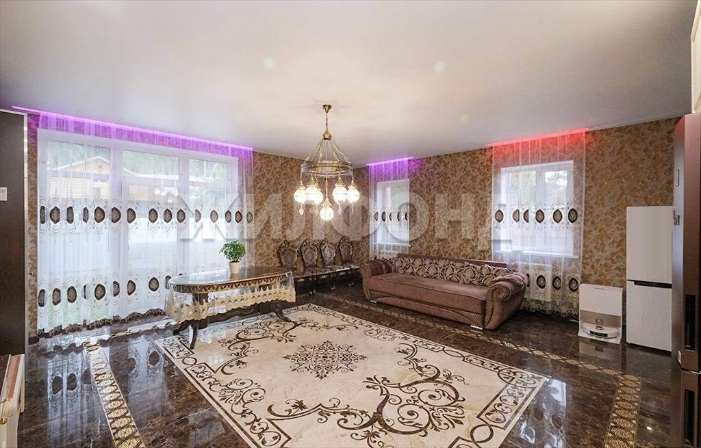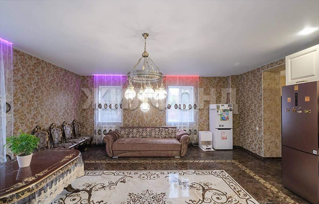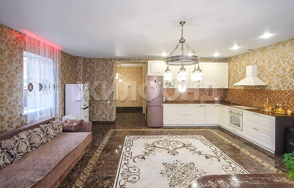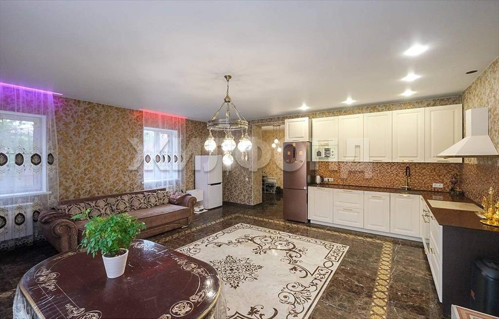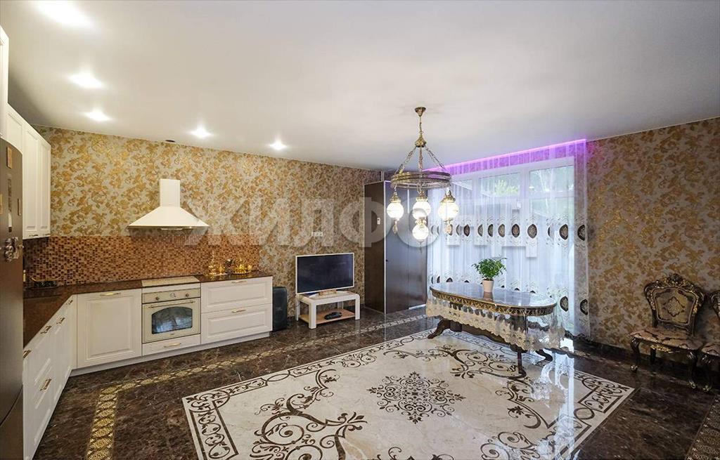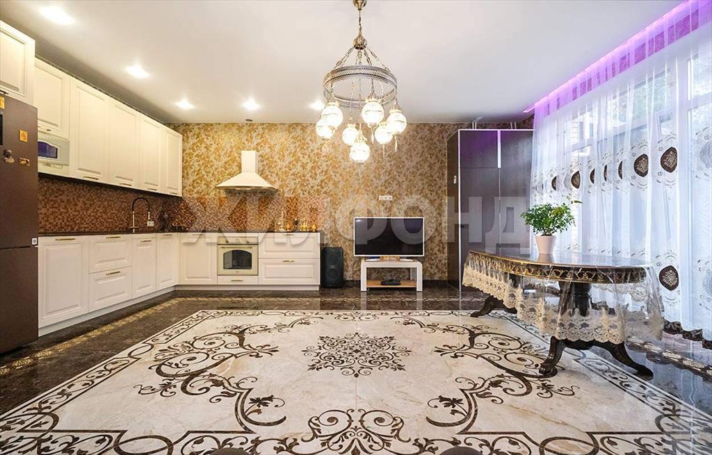 На первом этаже располагается просторная кухня-гостиная с панорамным окном и первый санузел. Зона кухни оборудована установкой для фильтрации воды. Пол первого этажа с подогревом. В гостиной на полу панно из керамомозайки. Лесница из массива дерева с подсветкой.