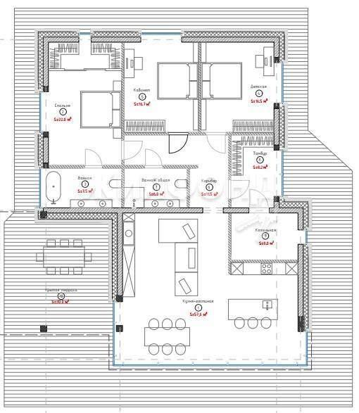 Фундамент дома - плита с ребрами вниз, утепленная 100 мм ХРS по всей площади фундамента. Фундамент устроен на песчаной подушке толщиной 400мм. Выполнен дренаж по периметру дома. Стены - керамический полнотелый кирпич, с монолитными колоннами в местах усиления. Утепление стен 250мм минеральной ваты. Перекрытие монолитная железобетонная плита. В кухне-гостиной устроен консольный свес перекрытия. Крыша утеплена в среднем 170мм ХРS с учетом уклонов. Дом облицован кирпечем RЕСKЕ BRIСKЕRЕI.