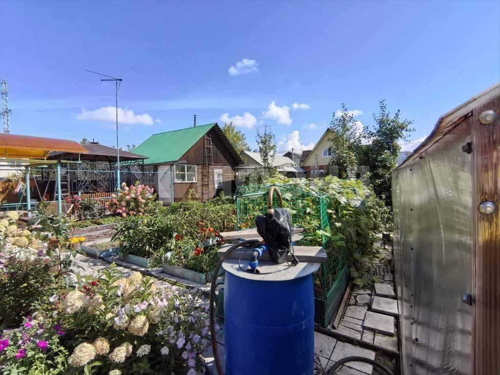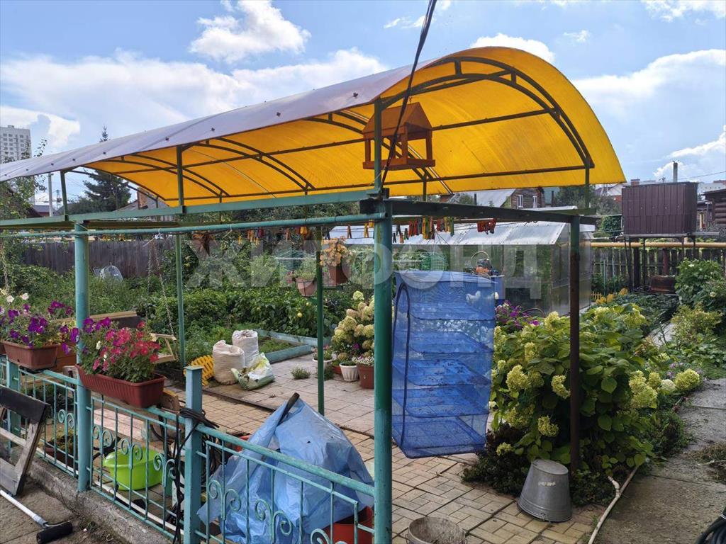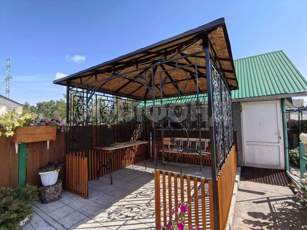 Есть красивая резная беседка с мягкой черепичной крышей а также теплица с автоматической системой полива для выращивания овощей. Посажено много цветов, между грядками уложена плитка для удобства прогулок.