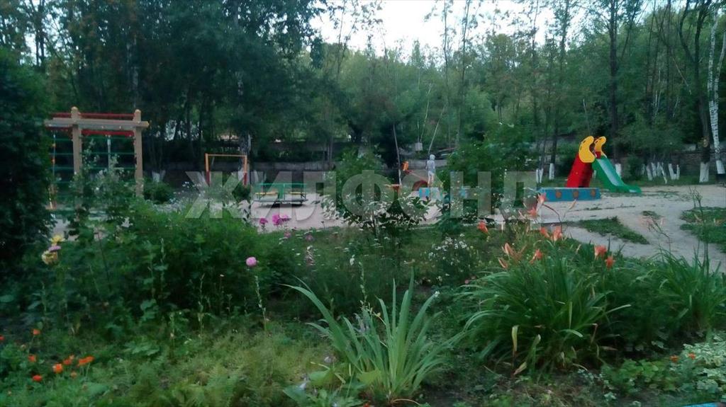 Окна выходят на огороженную зеленую площадку и детский садик.