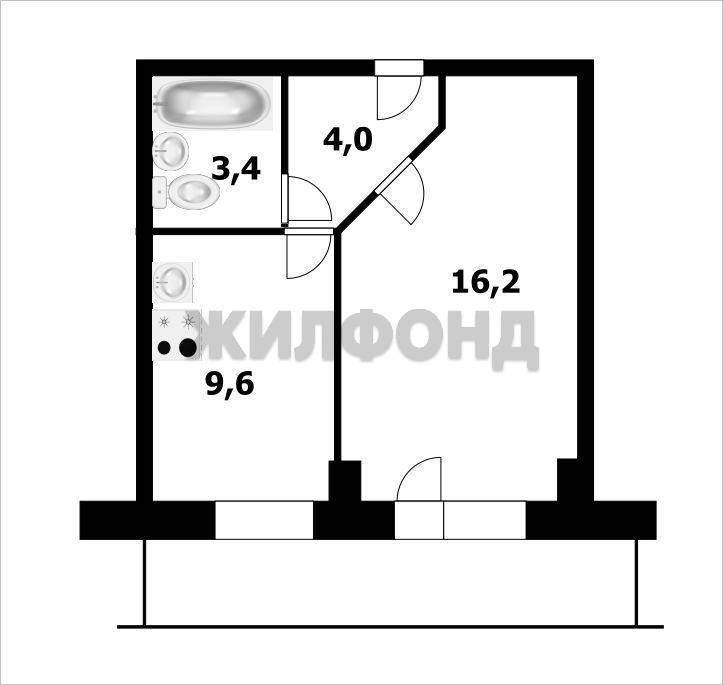 общая 34,2 м2, жилая 16,2 м2, кухни 9,6 м2 |